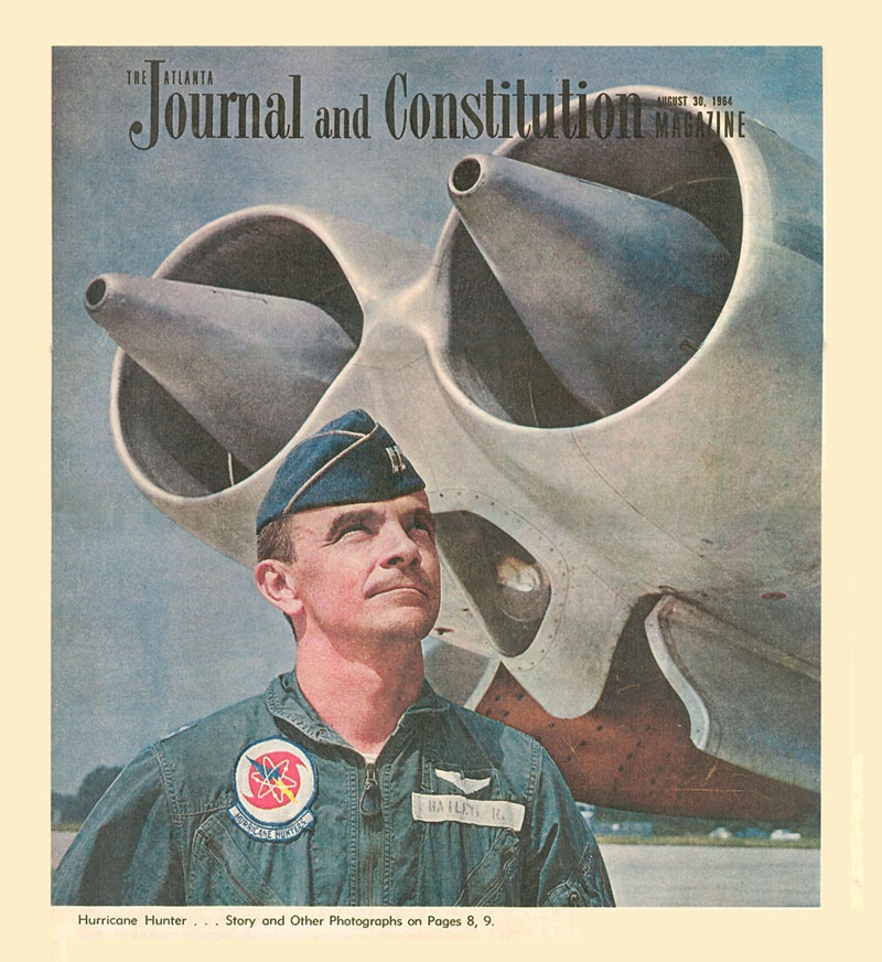 well as to a detachment  in Alaska. One example of this attention comes from the Atlanta Journal and Constitution Magazine of August 30, 1964. This weekend insert had full page cover showing Captain Robert Bailey of the 53rd WRS standing in front of the No. 4 and 5 engines of WB-47E tail number 51-2366. Captain Bailey, along with Major Dale Sutherland and Captain David McGrath, were preparing for a flight described by the article's author as a Hurricane Patrol. The two page spread inside the magazine (plus two more pages of text) was titled "Hurricane Hunters of Hunter." It talked about the 53rd WRS transition from the WB-50D to the new WB-47E, and its move from Kindley AFB, Bermuda, to their new home at Hunter AFB in Savannah, Georgia. |